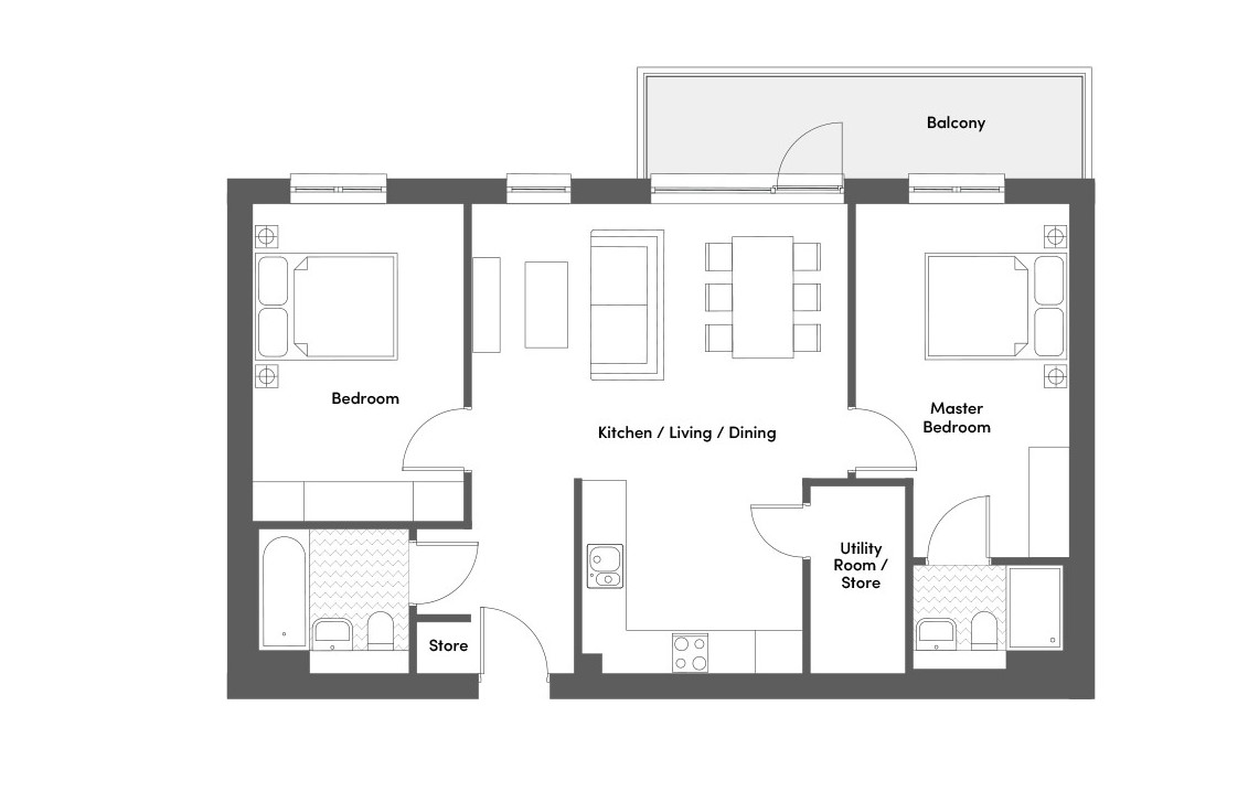 A clever layout, with 2 large double bedrooms, a well designed and flexible living area, private balcony and plenty of storage. All feature high quality kitchens and bathrooms, and bespoke U fit-out.